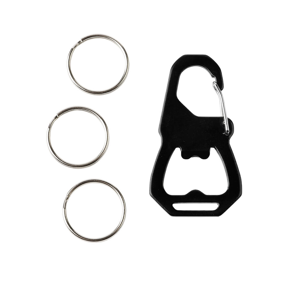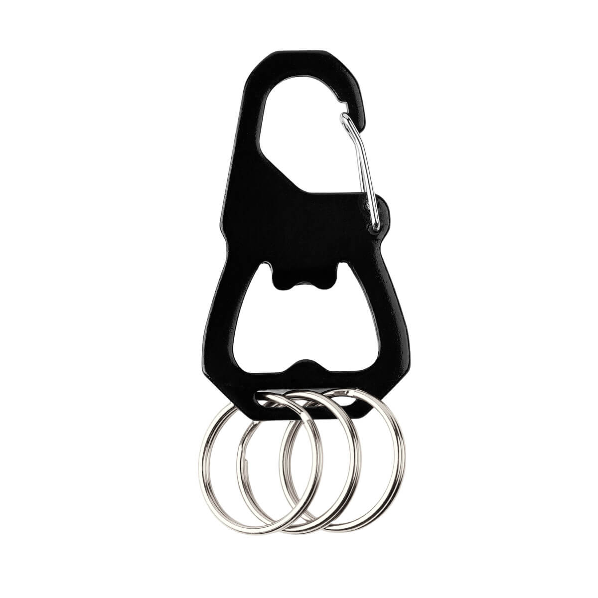 Llavero metálico multifunción con gancho, destapador y tres aros para llaves. Organiza y transporta tus llaves con un accesorio práctico y de uso diario.