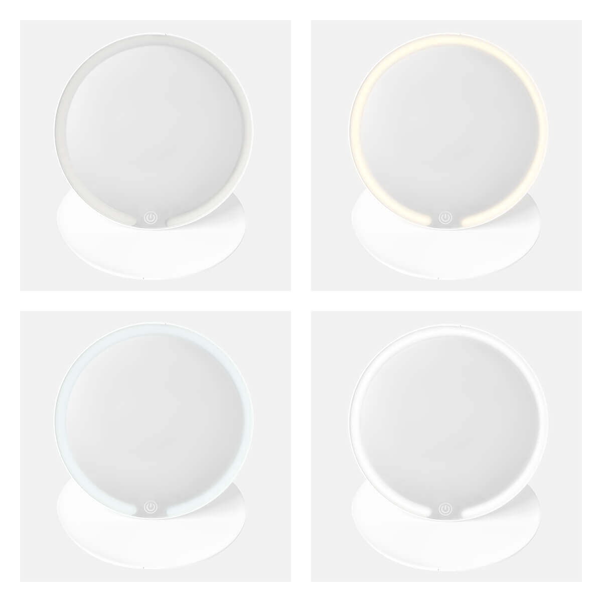 Espejo plegable con iluminación LED con 3 modos de luz: fría, natural y cálida. Pulsando el botón del sensor táctil one touch. Duración de luz de 3.5 hrs. Incluye espejo magnético de aumento 5x, puerto de carga y cable tipo C.