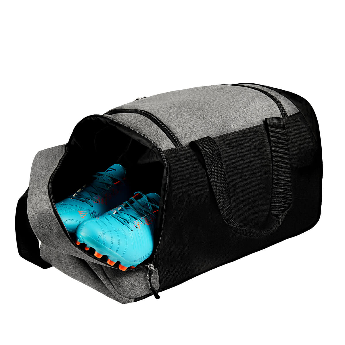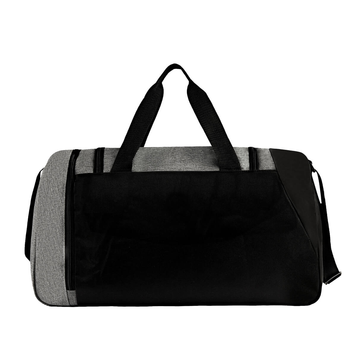 Maleta deportiva. Compartimento principal con cierre y un bolsillo adicional en la parte frontal. Además, cuenta con un compartimento lateral para calzado. Incluye correa ajustable para hombro y asas de agarre superior.