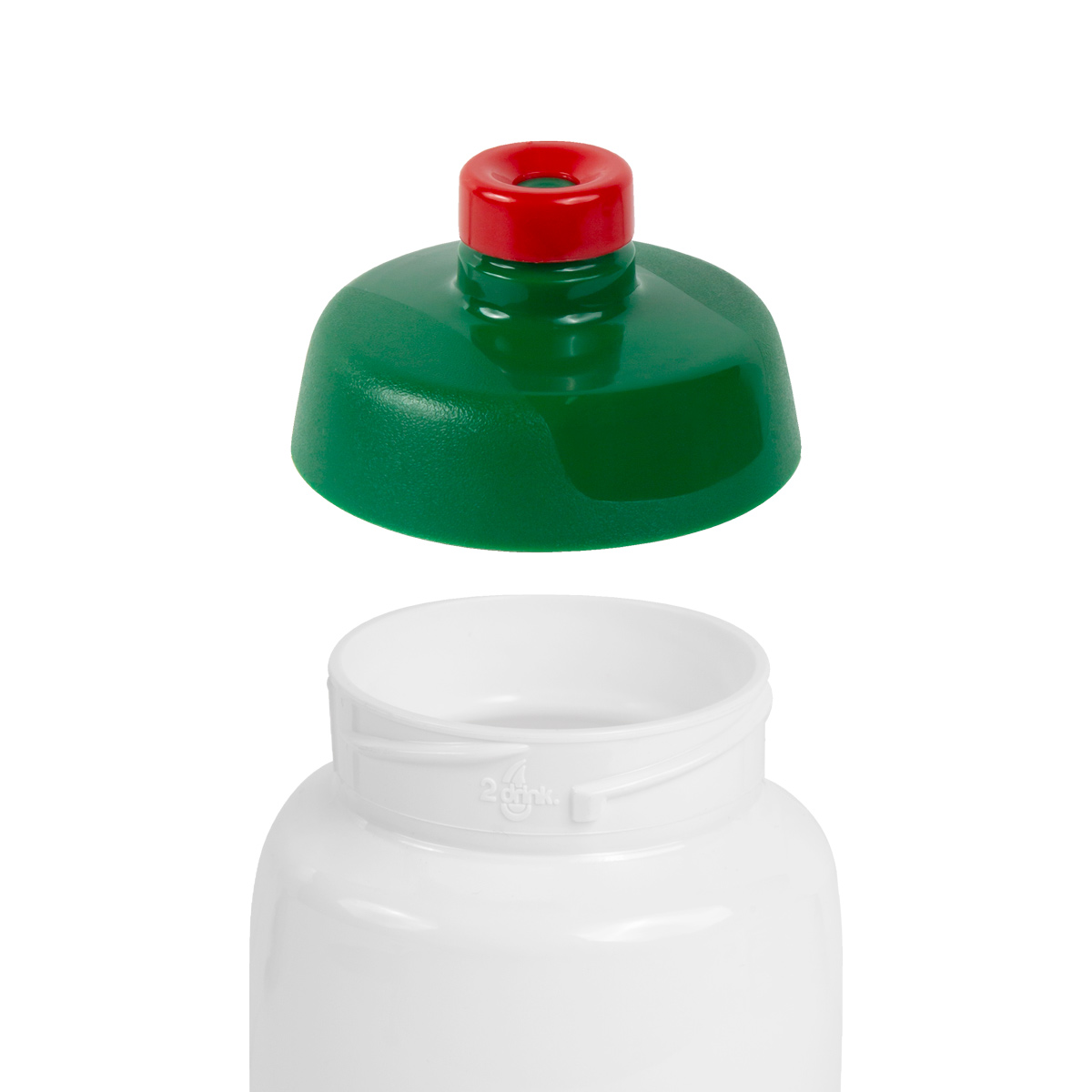 Cilindro de plástico sólido tricolor. Sistema de rosca twist-off que permite abrir y cerrar la tapa en un giro. Incluye válvula de seguridad. Mantener el linner en el interior de la tapa en todo momento, se debe retirar hasta su uso final. No exponer el cilindro a temperaturas mayores a 40 °C y revisar que la tapa no esté cerrada completamente para su almacenamiento y transportación. Mantener en su empaque individual antes y después de su transformación. No apto para bebidas calientes. No introducir en microondas ni lavavajillas.