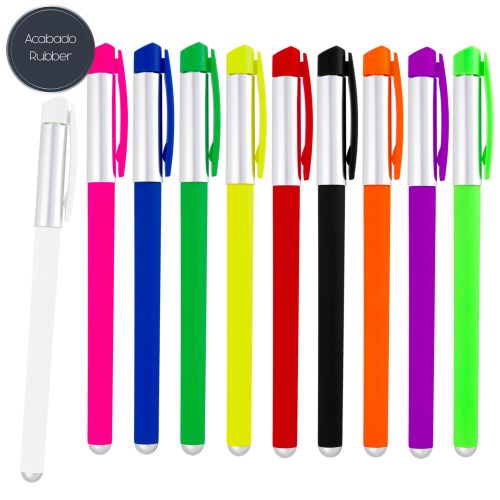 Bolígrafo con acabado rubber de tinta gel y clip de plástico.