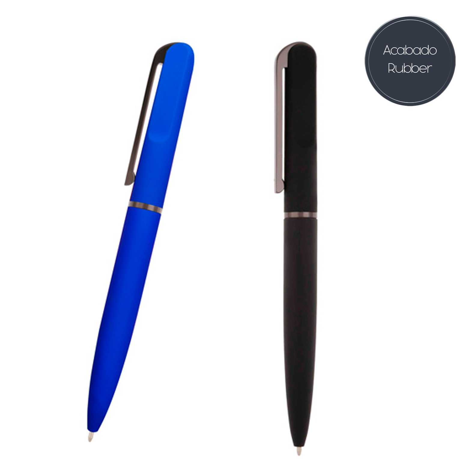 Bolígrafo con acabado rubber; clip metálico y mecanismo retráctil.