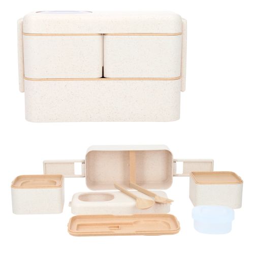 Contenedor de alimentos de weat straw de 2 niveles con 3 compartimentos ensamblables; un mini recipiente; espacio para cuchara y tenedor.