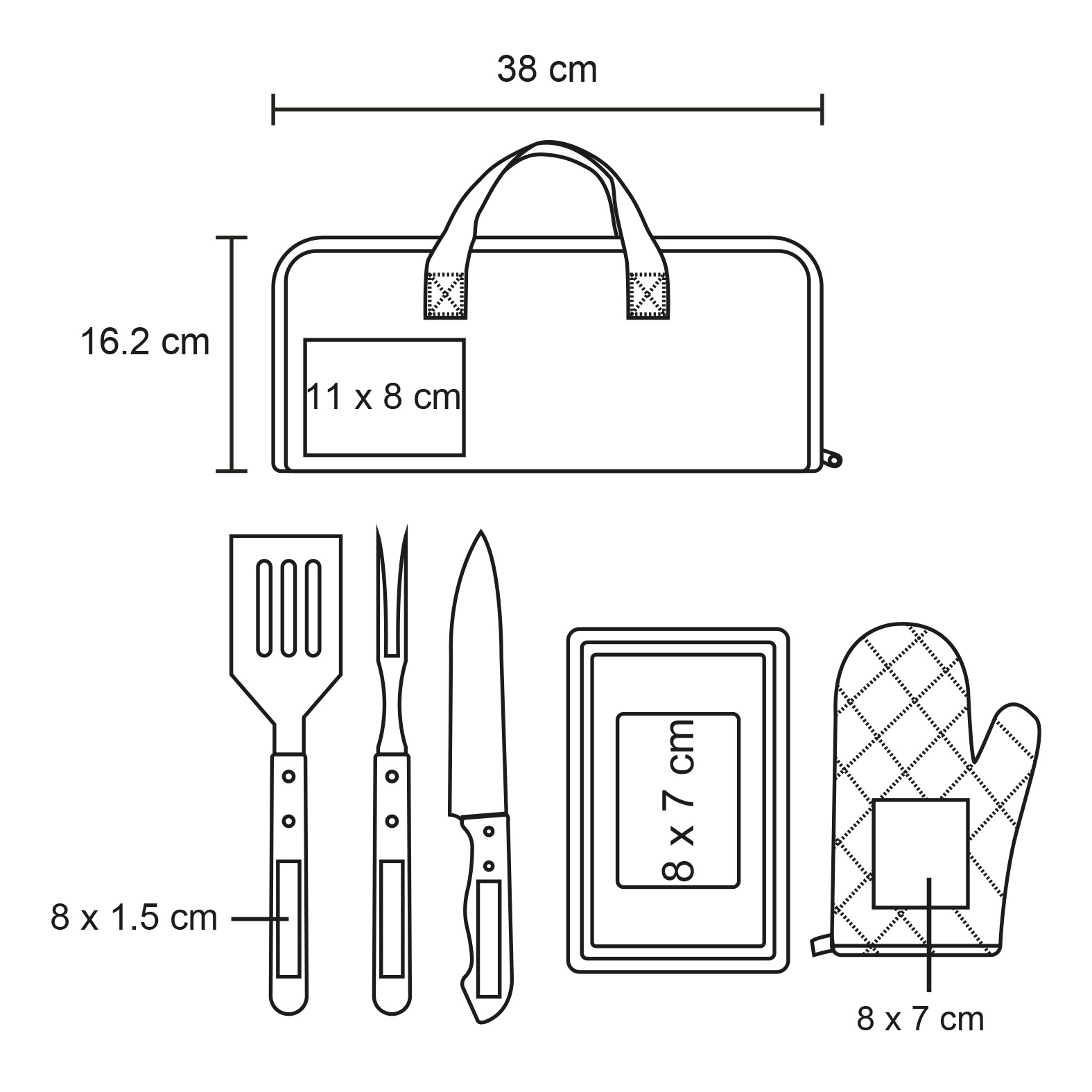 Estuche portatil con utensilios para BBQ. Incluye tenedor; volteador; cuchillo; tabla y guante.
