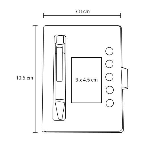 Mini libreta de papel reciclado con notas adhesivas y mini bolígrafo; con 80 hojas blancas punteadas.
