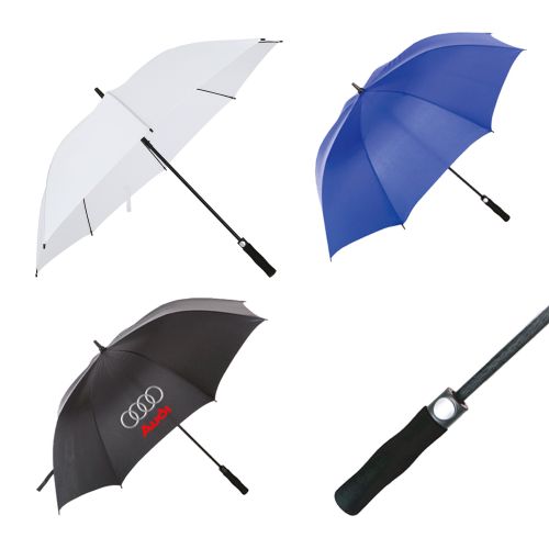 Paraguas circular pongee con sistema de apertura automático; 8 gajos; varillas reforzadas; eje central de fibra de carbono y mango de EVA. Incluye funda con agarradera.