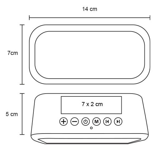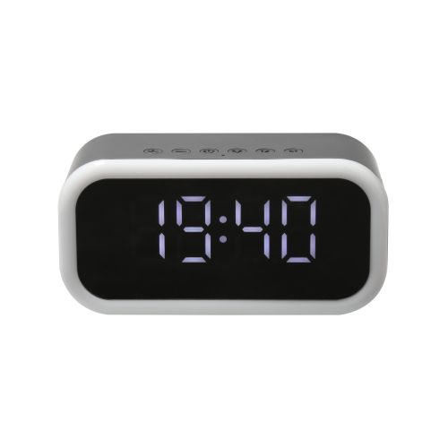 Bocina Bluetooth portátil con reloj digital; radio FM y micrófono para contestador de llamadas; cuenta con entrada para Aux; TF y cable de carga.
