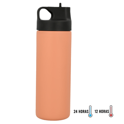 Termo de acero inoxidable de doble pared insulado al vacío con acabado rugoso; su tapa enroscable cuenta con una agarradera; boquilla abatible y popote.
