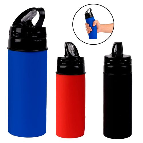 Cilindro de silicón; con tapa enroscable; boquilla abatible; agarradera en la parte superior y asa de silicón removible.