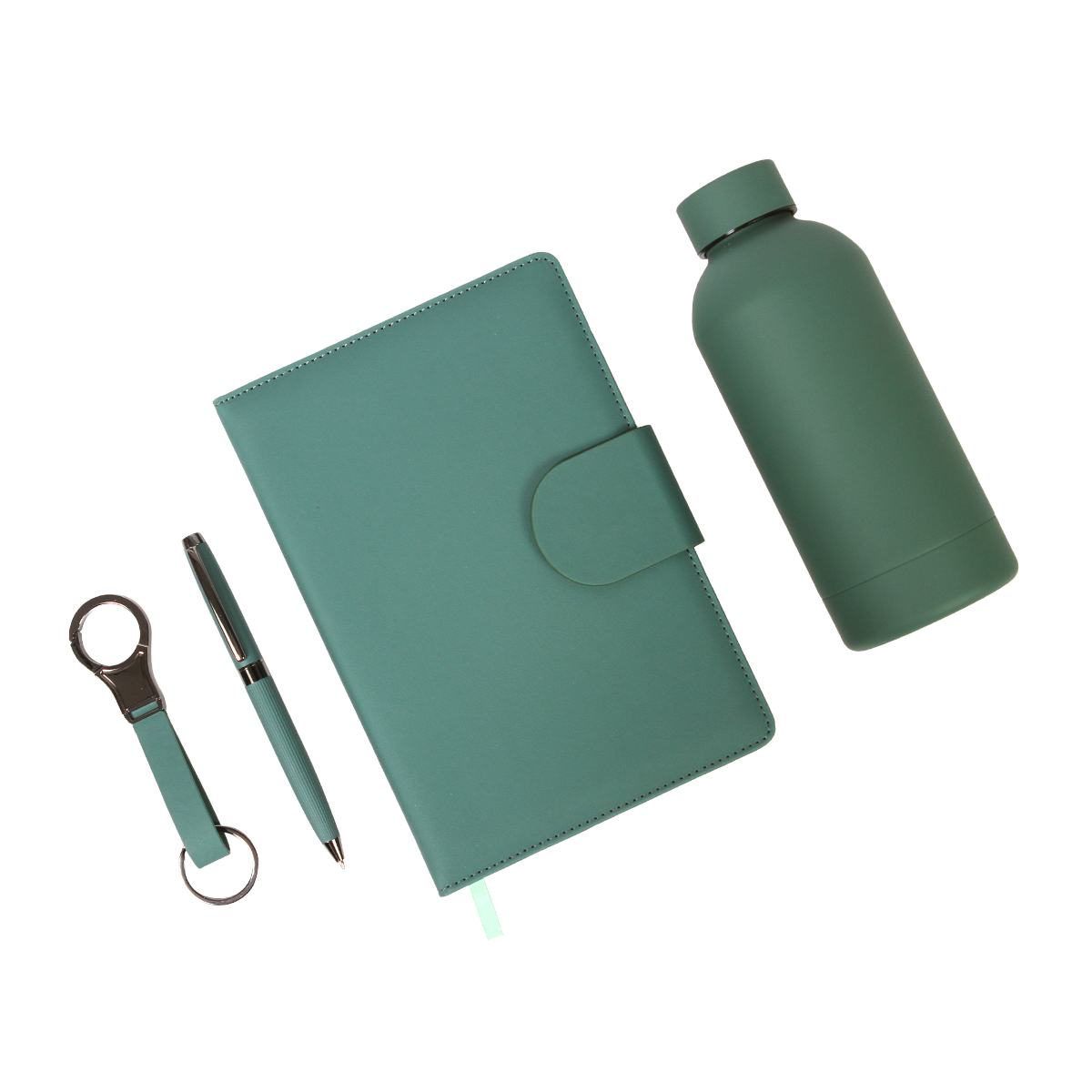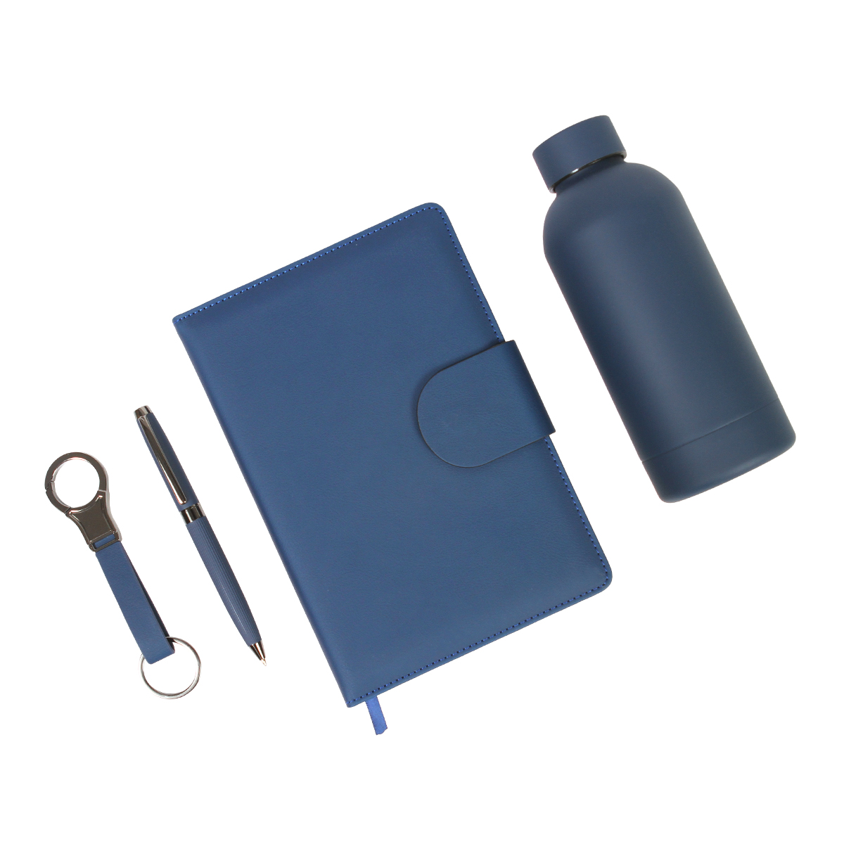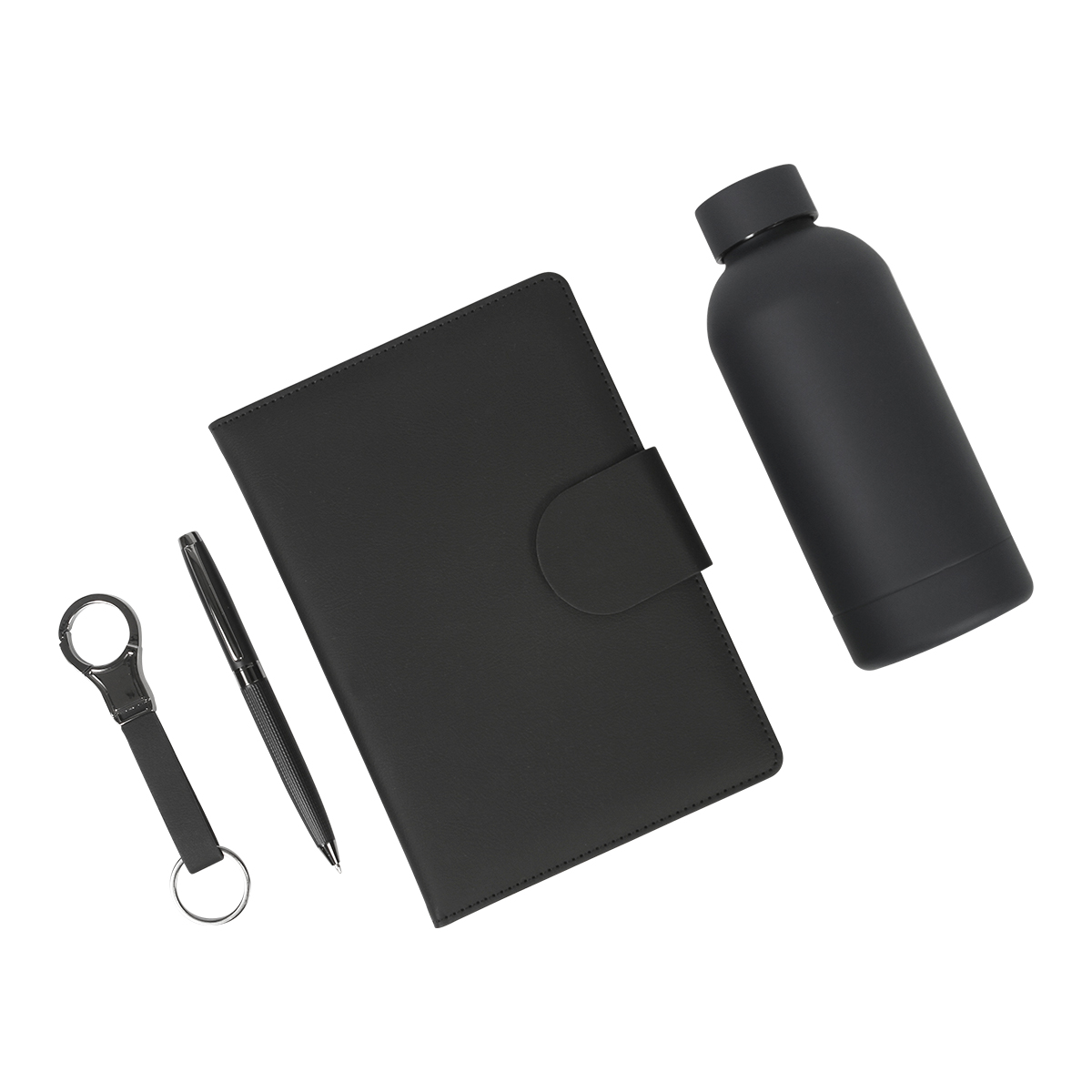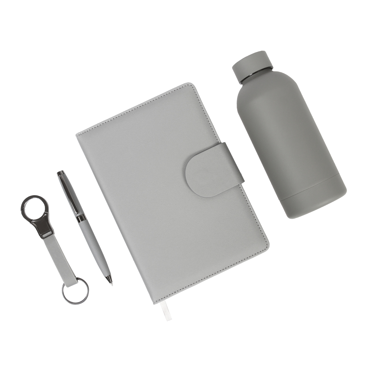 Set ejecutivo 4 en 1. Incluye libreta de 100 hojas de 80 g, bolígrafo tipo ball pen fabricado en acero inoxidable con tinta de escritura en color negro, llavero fabricado en PU y acero y termo de 350 ml fabricado en acero.