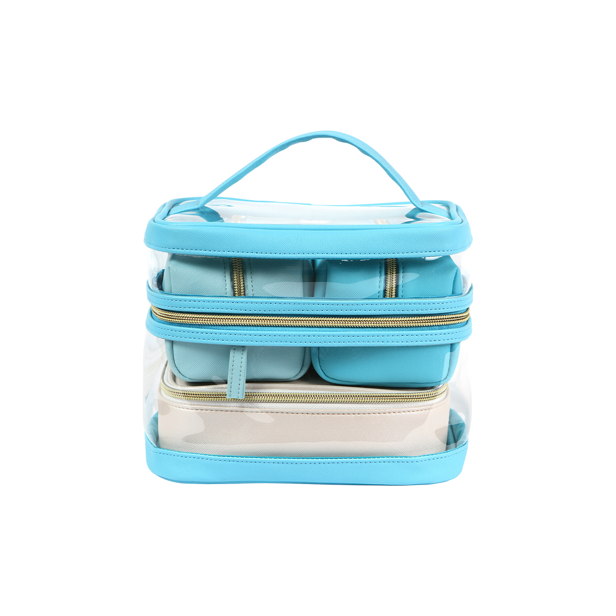 Incluye una cosmetiquera fabricada en PVC transparente con asa superior y cierre ideal para llevar todo a la vista y con fácil acceso.