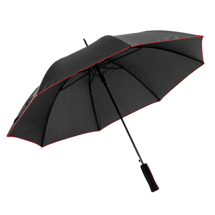 Mantente seco y elegante.Paraguas APERTURA AUTOMÁTICA Y CIERRE MANUAL. Eje y varillas metálicas. Tela negra con detalle de color. Mango de goma eva de doble color. Botón a presión. Cierre con correa de velcro.Medidas: Ø 105 cm. 8 gajos. Ancho gajo 40 cm.